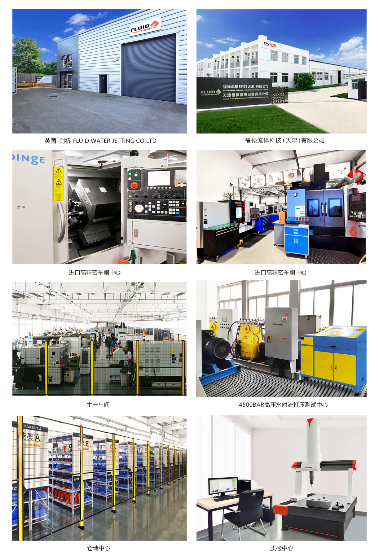 福禄流体科技(天津)有限公司坐落于天津市西青经济技术开发区赛达集美工业园,是天津福禄机电设备有限公司与英国 FLUID WATER JETTING CO LTD 联合成立的合资企业。公司主营业务包括:高压水射流清洗工具、自动化清洗执行机构和300MPa超高压柱塞泵及其成套设备的研发、制造和销售。