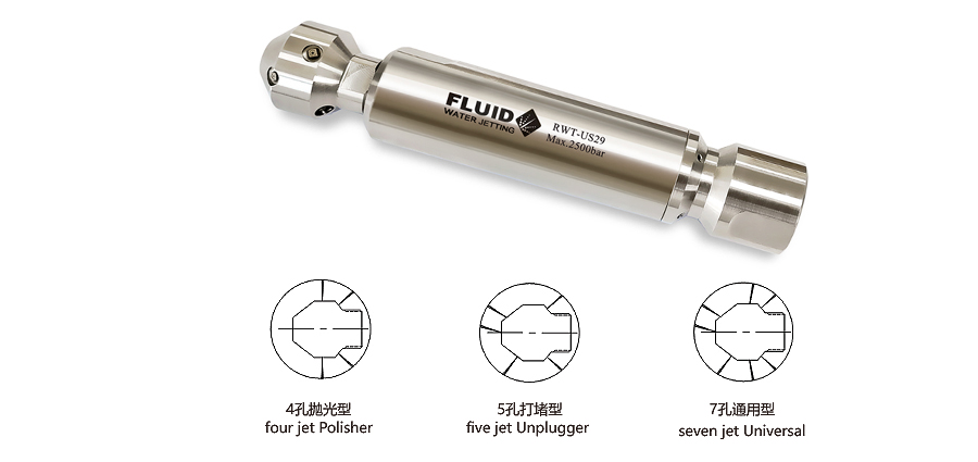 三种标准清洗头可以安装M4合金喷嘴(Max.2500bar)或者M4宝石喷嘴(Max.2800bar)。通用型清洗头共计安装7个喷嘴,其中3个斜向前喷,2个90°垂直喷射,另外2个斜向后喷射;抛光型清洗头共计安装4个喷嘴,其中2个90°垂直喷射,另外2个斜向后喷射;打堵型清洗头共计安装5个喷嘴,其中3个斜向前喷,另外2个斜向后喷。